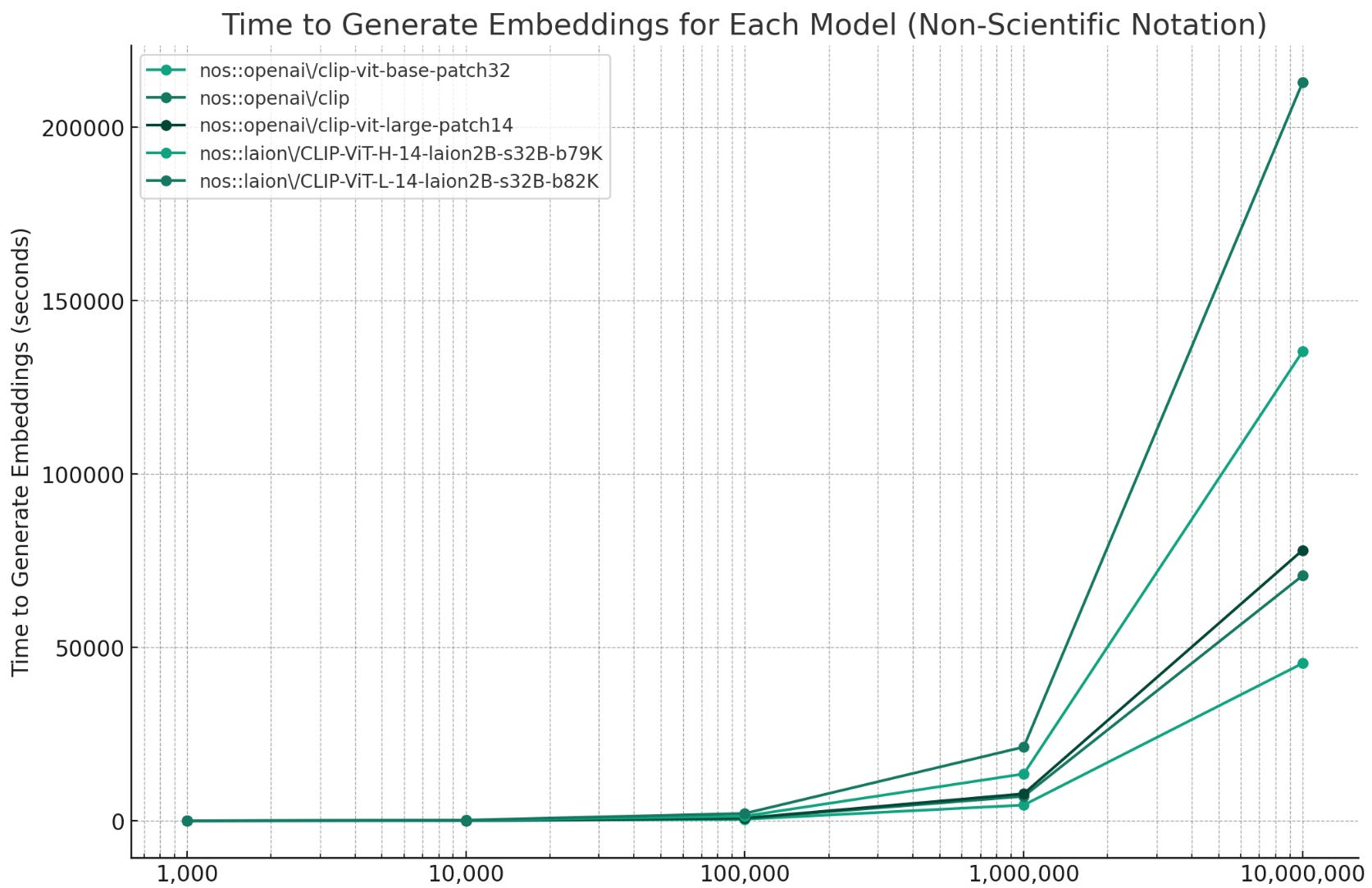 Can you compute how long it would take to generate embeddings with each model for workload sizes in powers of 10, starting at 1000 image embeddings and ending at 10,000,000. Please plot these for each model in a graph.