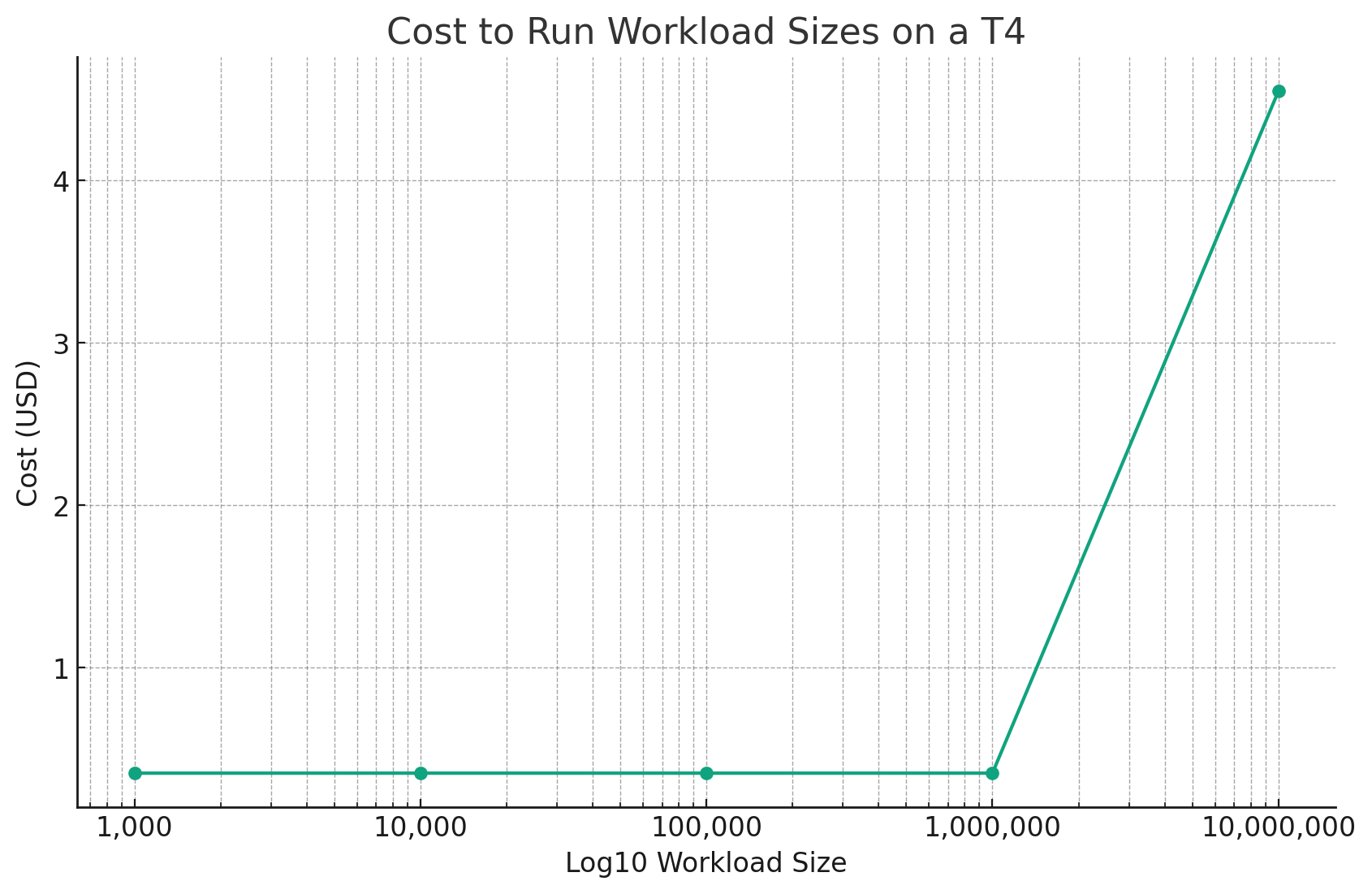Can you compute how much it would cost on a T4 with 1 GPU to generate embeddings with the cheapest model for workloads of powers of 10, starting at 1000 image embeddings and ending at 10,000,000. Please plot these in a graph.
