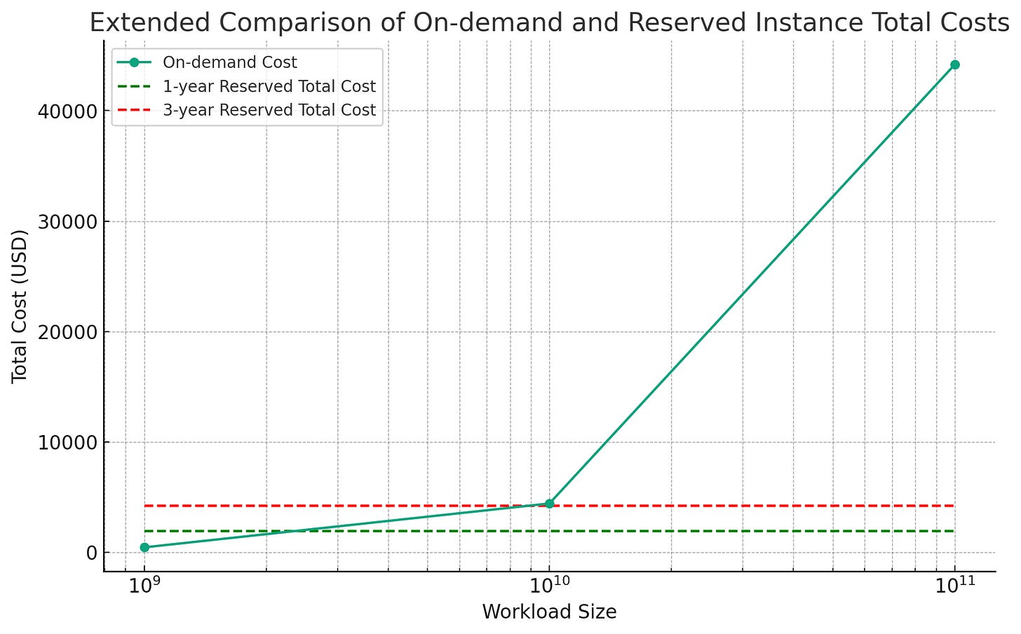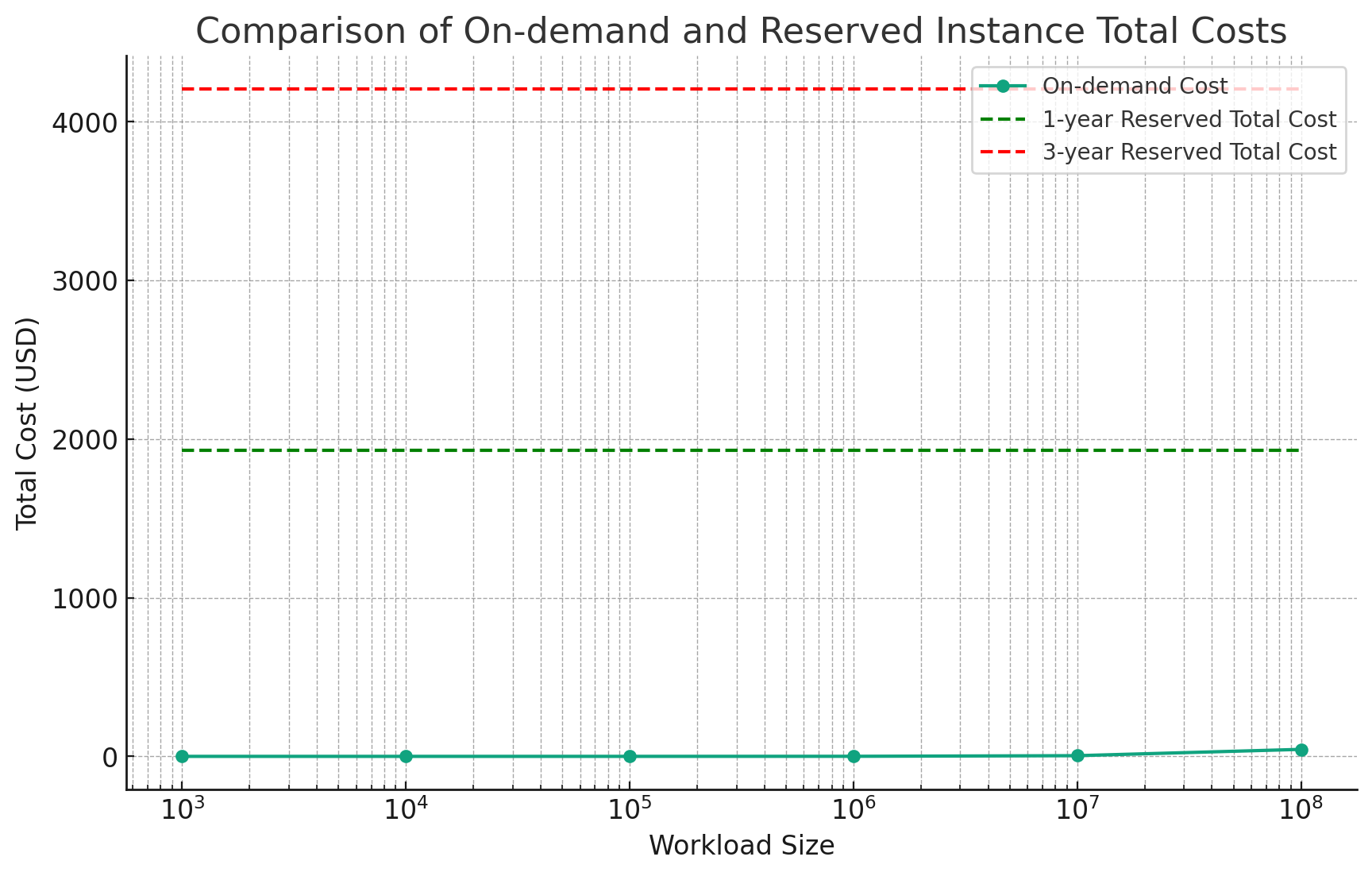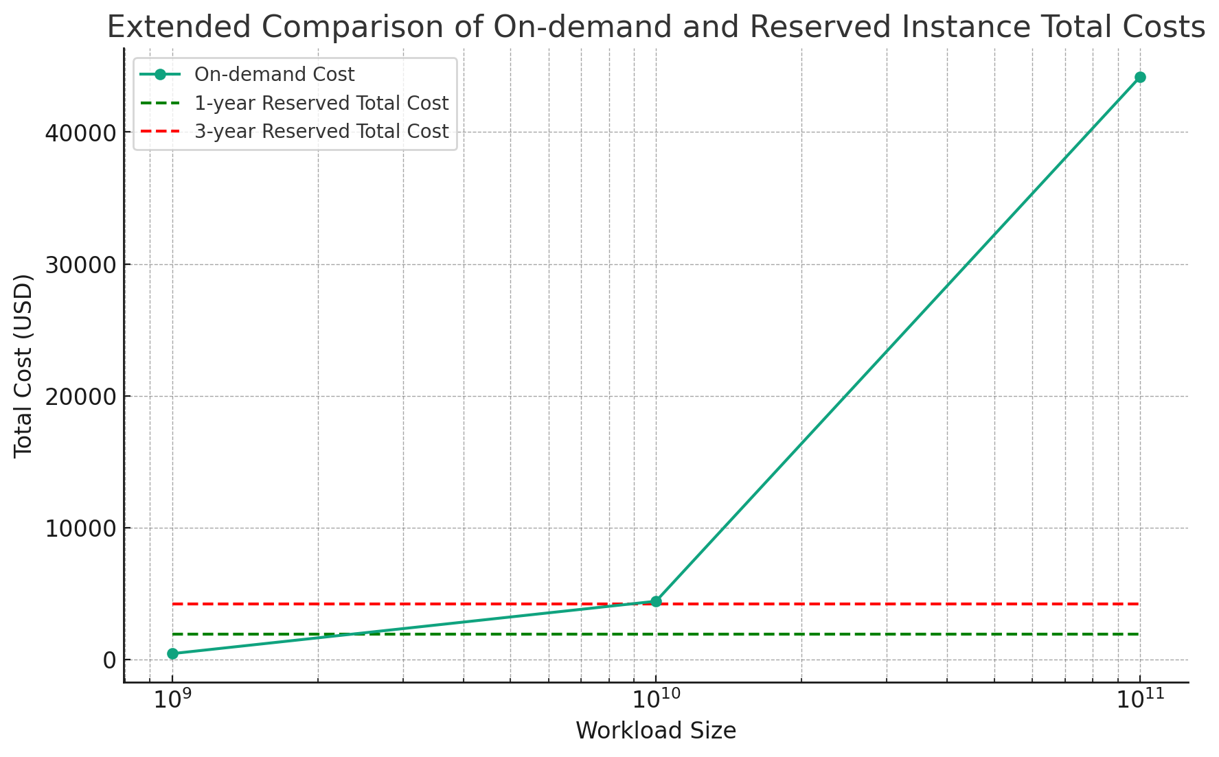 The above looks reasonable assuming a minimum reservation of 1 hour (we aren’t doing serverless, we need to pay for the whole instance for the whole hour in our proposed cloud landscape). For 10 million embeddings, the total is something like 13 hours, so assuming an on-demand price of $0.35 we have 0.35*13 ~= 0.455, pretty close to the graph. But what if we wanted to index something like YouTube with ~500PB of videos? Ok, maybe not the whole site, but a substantial subset, maybe 10^11 images: if we extrapolate the above we’re looking at $40,000 in compute, which we would probably care about fitting to our workload. In particular, we might go with a reserved rather than an on-demand instance for a ~%50 discount, but at what point does that pay off? Unfortunately at time of writing, Skypilot doesn’t seem to include reserved instance pricing by default, but for a single instance type it’s easy enough to track down and feed to InfraBot: a 1 Year commitment brings us down to $0.220 per GPU, and a 3 Year commitment to $0.160 per GPU. It’s still higher than the spot price of course, but at this scale its reasonable to assume some SLA that prevents us from halting indexing on preemption. Let’s see if we can find a break-even point.