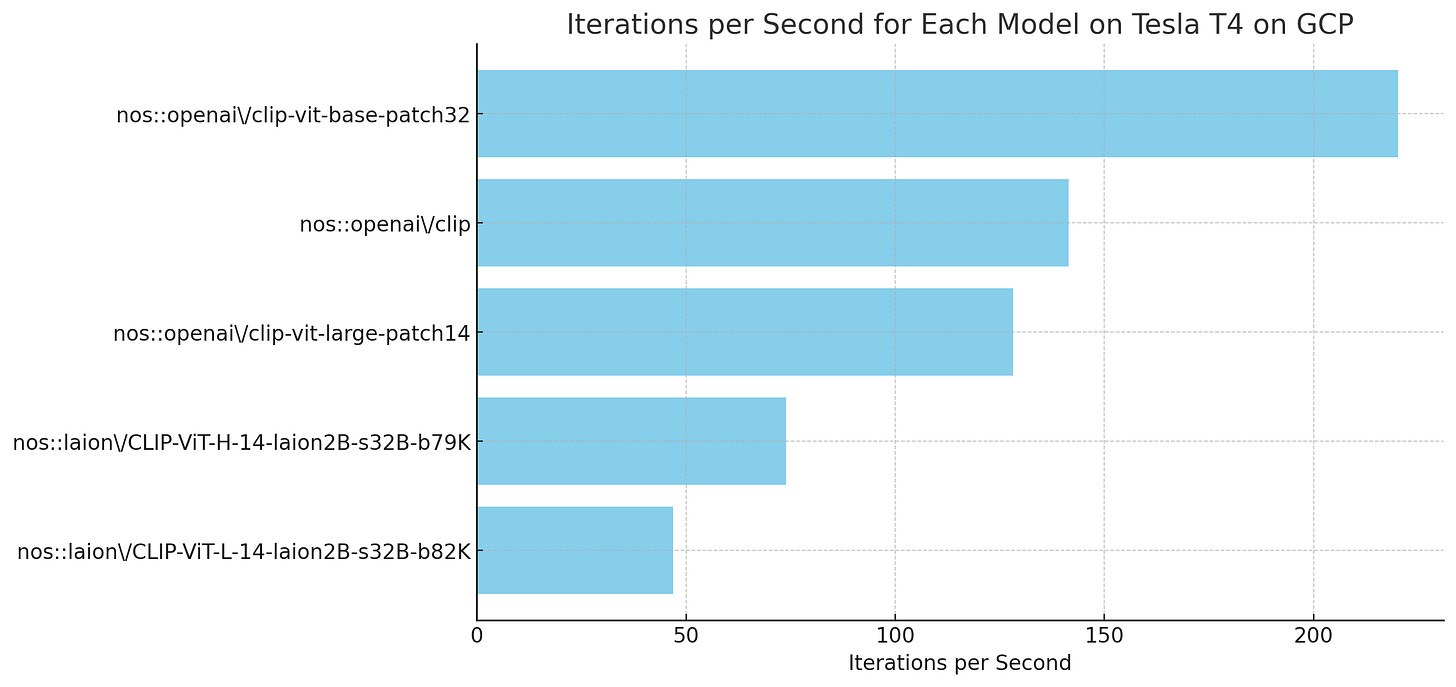 nos::laion/CLIP-ViT-L-14-laion2B-s32B-b82K: 46.95 iterations per secondNote that I didn’t tell it anything about the structure of the profiling data: it was able to track down the “forward::execution“ context on its own and convert everything into reasonable units. Neat! Let’s get this into a table: