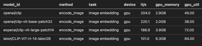 We see a breakdown across four different image embedding models including the method and task (interchangeable in this case, each CLIP variant will support both Image and Text embedding as methods), the Iterations per Second, GPU memory footprint (how much space did this model have to allocate) and finally the GPU utilization, which measures (in a very broad sense) how efficiently we are using the HW. A few things to note: the image size is fixed to 224X224X1 across all runs with a batch size of 1. In practice, the Iterations/Second will depend tremendously on tuning the batch size and image resolution for our target HW, which will be the subject of a followup post. For now we’ll take these (admittedly naive) numbers at face value and see what we can work out about how exactly to run a large embedding workload. We’re going to use a fantastic tool called Skypilot to deploy the profiler to a Tesla T4 instance on GCP: